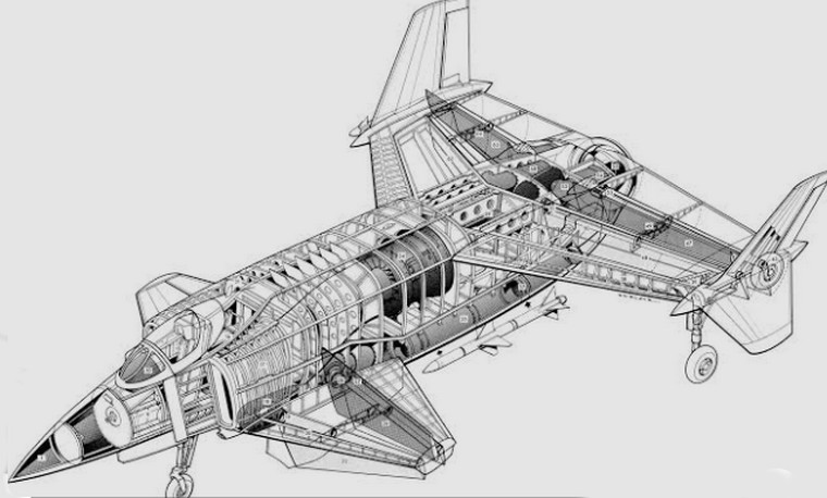 In July 1977 the XFV-12A was officially revealed. It had the looks. The aircraft was 43 feet long and had a wingspan of 28 feet. At 10 feet tall, empty it weight 13,800 lb, with a gross weight of 19,500 lb. It used a special wing design that increased lift by directing exhaust through openings in the wings, similar to how venetian blinds work. This design limited the ability to carry weapons to areas under the narrow fuselage and two missile mounts on the wings.