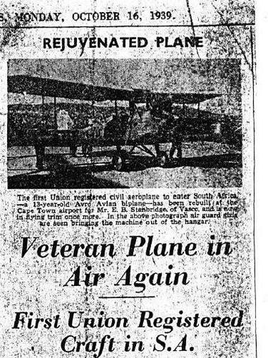 Report in the Cape Times of 6 October 1939 on the Avians flight after the restoration by Eric Stanbridge